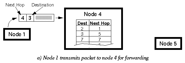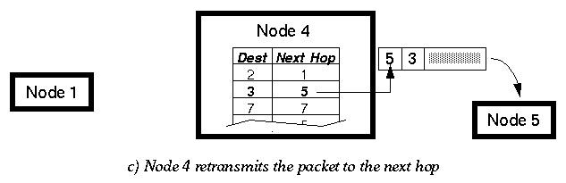 Figure 2.1 illustrates the routing procedure in DSDV. In this example, a packet is being sent from node 1 to node 3 (node 3 is not shown). From node 1, the next hop for the packet is node 4 (Figure 2.1 a). When node 4 receives the packet, it looks up the destination address (node 3) in its routing table (Figure 2.1 b). Node 4 then transmits the packet to the next hop as specified in the table, in this case node 5 (Figure 2.1 c). This procedure is repeated as required until the packet finally reaches its destination.