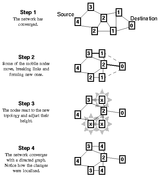 When a node discovers that a route to a destination is no longer valid, it adjusts its height so that it is a local maximum with respect to its neighbors and transmits an update packet. This process is illustrated in Figure 3.2.